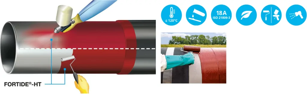 O FORTIDE®-HT oferece proteção durável para tubulações com temperaturas máximas de operação de a´te +150°C (+302°F). Ideal para revestimento de juntas soldadas e oleodutos, gasodutos e sistemas de aquecimento urbano. Além disso, garante proteção segura e confiável mesmo em temperaturas ambiente extremamente elevadas.